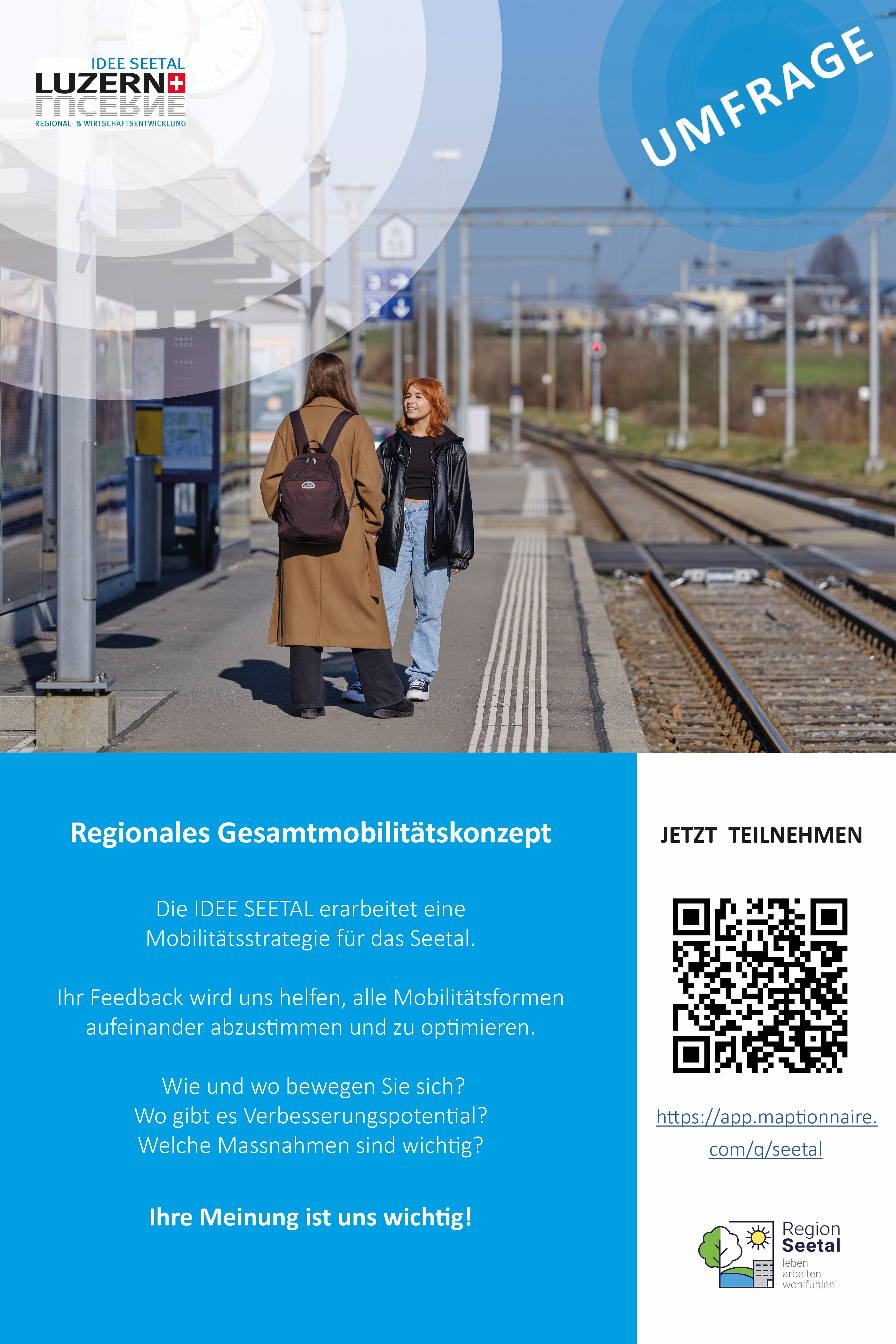 Damit das Mobilitätskonzept auf die Bedürfnisse der Bevölkerung abgestimmt werden kann, ist die Mithilfe der Seetalerinnen und Seetaler wichtig. Wie und wo bewegt man sich im Seetal? Wo gibt es Verbesserungspotenzial und welche Massnahmen wären besonders wichtig?